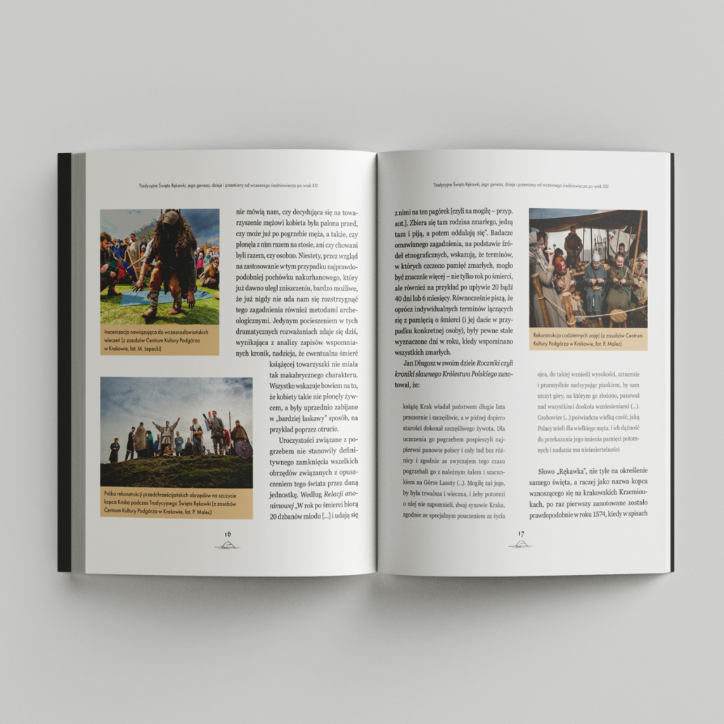 Przygotowaliśmy kompleksowe opracowanie wydawnicze książki „Święto Rękawki” dla Centrum Kultury Podgórza w Krakowie. Pracę rozpoczęliśmy od spotkania z autorką książki, pracownikami Centrum. Na spotkaniu ustaliliśmy format książki, odebraliśmy sugestie dotyczące wyglądu publikacji, dobrania zdjęć, oraz wybraliśmy odpowiedni font dla książki.