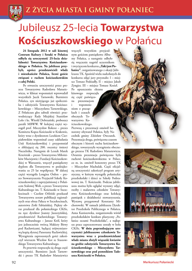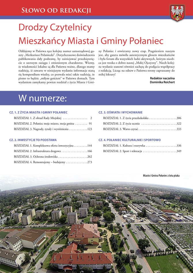 Skład informatora samorządowego dla Urzędu Miasta i Gminy w Połańcu pt. Merkuriusz Połaniecki, projekt layoutu i okładki, przygotowanie do druku. Braliśmy udział w tworzeniu makiety czasopisma i uporządkowaniu materiałów, a także wprowadziliśmy korektę. Na koniec zajęliśmy się drukiem i dostarczyliśmy gotowy informator do Urzędu Miasta.